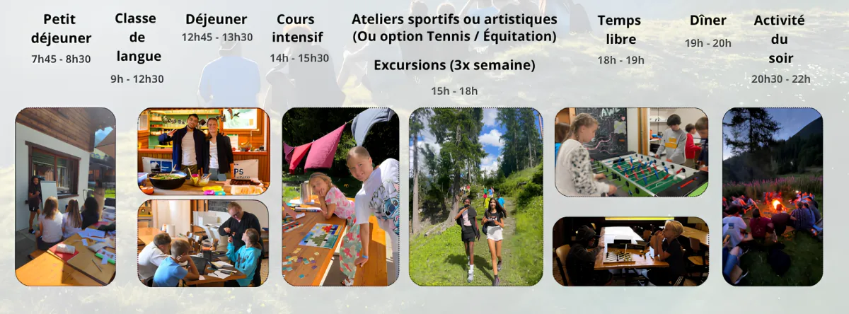 L'après-midi : Les enfants peuvent choisir entre différents ateliers sportifs ou artistiques. Des options payantes sont également proposées, comme des cours de tennis, d'équitation ou des cours de langue intensifs.